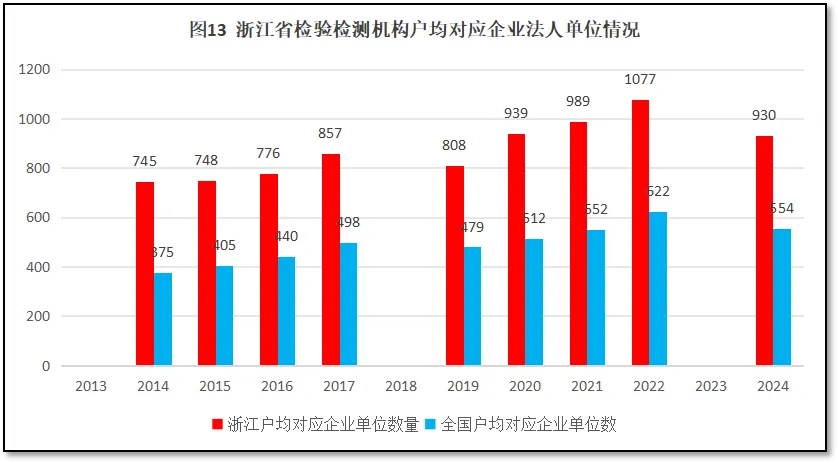 由图13可见,浙江省检验检测机构户均对应的企业法人单位数量逐年增高,且一直远高于全国平均水平的,到2024年,浙江省检验检测机构户均对应的企业单位数量比全国平均水平高出近400家,这说明浙江地区制造业发达、企业数量众多,拥有好于其他省区的区位优势,对检验检测行业来说市场空间大,充满发展机会。